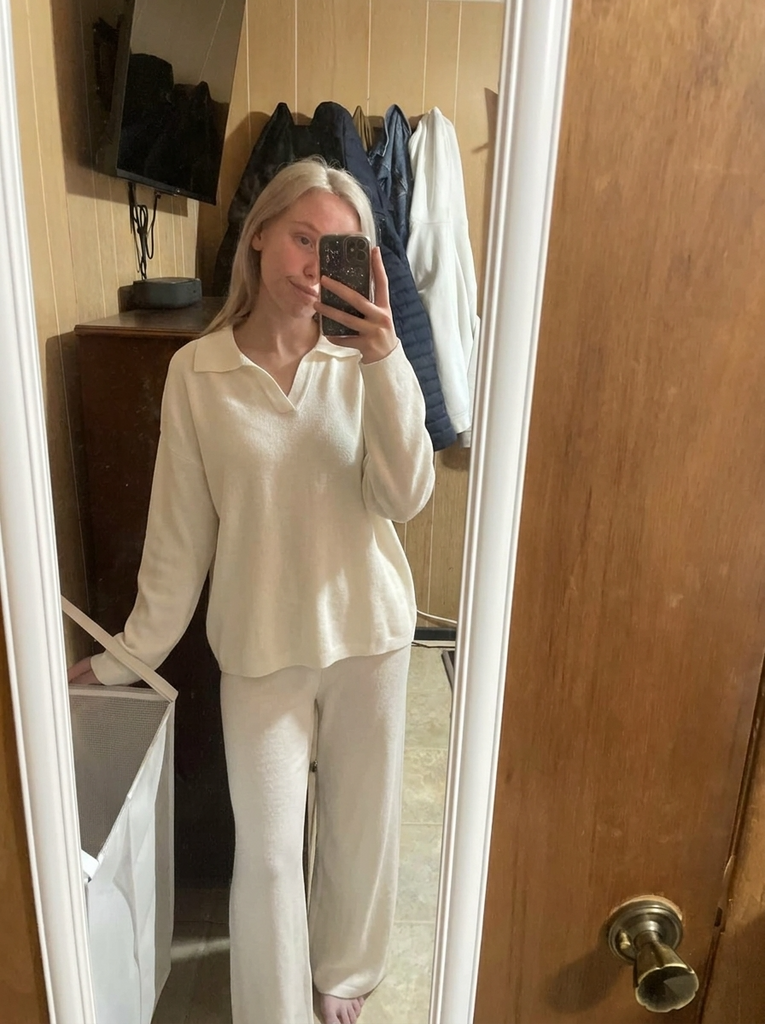 The structured polo collar adds polish to the relaxed oversized fit, while the high-waisted trousers create a long, modern line. Not just loungewear: pair the pieces separately for fresh looks with tees or denim.